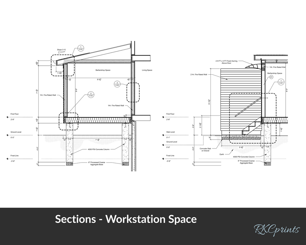 Designed a compact yet functional salon layout tailored for two workstations and a small customer waiting area. The design emphasizes accessibility and flow, incorporating a front-entry ramp alongside stairs, and providing a secondary rear exit for safety. The layout balances stylist efficiency with client comfort in a well-organized, code-compliant space.